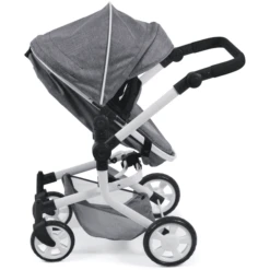 Splinternieuwe en modieuze combi-poppenwagen met veel praktische functies. De zwenkbare voorwielen maken bochten nemen makkelijk. Het zitje heeft een veiligheidsbeugel en laat zich in weinige stappen tot reiswieg veranderen. De deken voor de reiswieg kan ook als voetenzak gebruikt worden. Het zitje en de reiswieg kunnen beide zowel tegen de rijrichting in als met rijrichting mee gebruikt worden. De duwstang is in hoogte verstelbaar van ca. 47 tot 80 cm en past zich op die manier aan elke lichaamslengte aan. De duwstang laat zich zwenken, zodat de wagen vanuit beide kanten gereden kan worden.