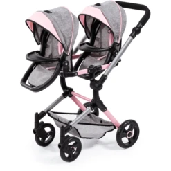 De kinderwagen heeft verstelbare zonnekappen en een in hoogte verstelbare duwbeugel, zodat hij optimaal aan de grootte van het kind kan worden aangepast. De zittingen van de tweelingduwwagen kunnen afzonderlijk in de richting van het kind of in de rijrichting worden bevestigd, zodat de poppen bijvoorbeeld ook naar elkaar kunnen kijken. Bovendien is het mogelijk de zitplaatsen zo uit te lijnen dat zij recht achter elkaar staan of dat de ene zitplaats verder naar beneden staat en de andere verder naar boven. De dubbele poppenwagen kan ook worden ingeklapt om ruimte te besparen.