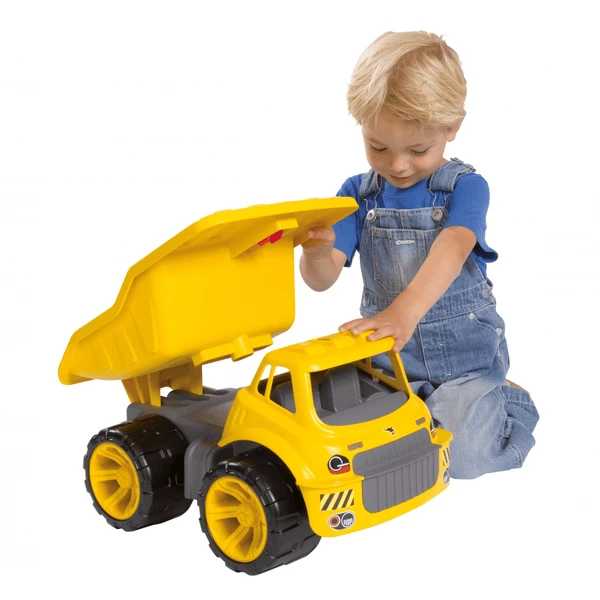 De BIG-Maxi-Truck voor kinderen vanaf 2 jaar: ongelofelijk groot en sterk. Met dit beresterke voertuig kunnen allerlei goederen worden getransporteerd; zand, bouwstenen of ander bouwmateriaal. De laadbak van de robuuste truck kan worden gekiept, heeft een laadvolume van 4,2 liter en is tot 25 kg belastbaar. Door een vergendeling aan de bovenkant wordt voorkomen dat de bak tijdens het rijden naar beneden klapt en de kostbare lading verliest. Eenmaal bij de bouwplaats aangekomen kan de lading worden uitgeladen door de bak naar achteren te kiepen.