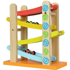 De auto racebaan met vier verdiepingen ziet er echt cool uit en kinderen zijn er urenlang zoet mee. De auto’s kunnen vanaf de bovenste etage helemaal naar onder rijden, de auto’s rolle zig-zag naar beneden.