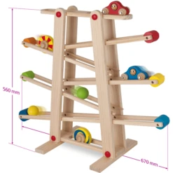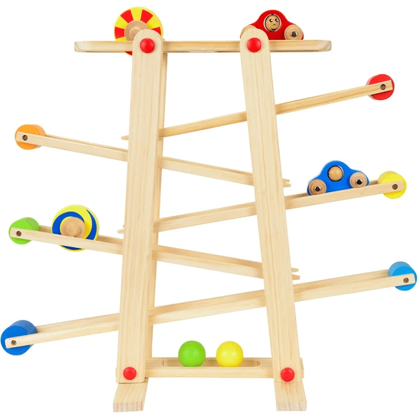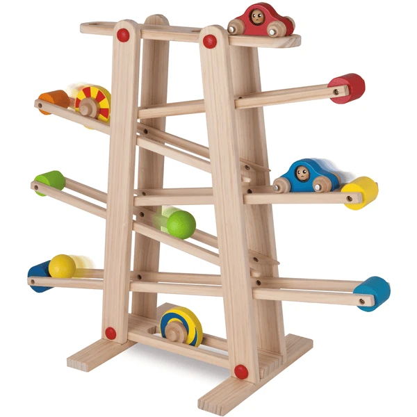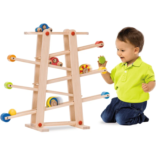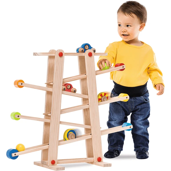 De Eichhorn knikkerbaan biedt kinderen veel plezier. 6 verschillende elementen zoals ballen, auto’s of gekleurde schijven rollen zigzaggend over de taxibaan.