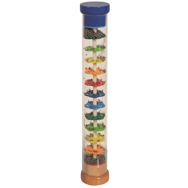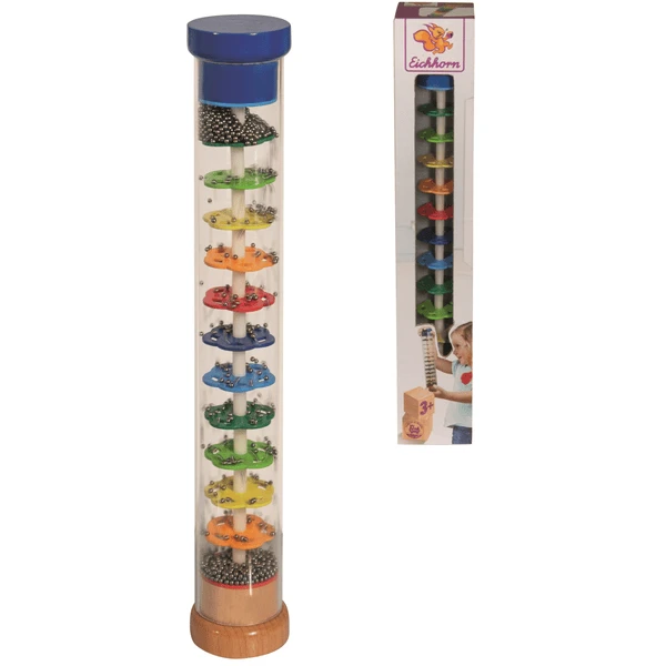 Regenmaker van Eichhorn van massief hout. Met plastic buis, waarin de kleine metalen bolletjes veel lawaai maken bij het bewegen.