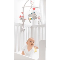 De mobiel wordt eenvoudig aan het babybedje bevestigd en is dus een schattige