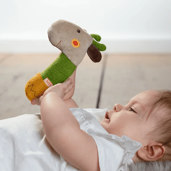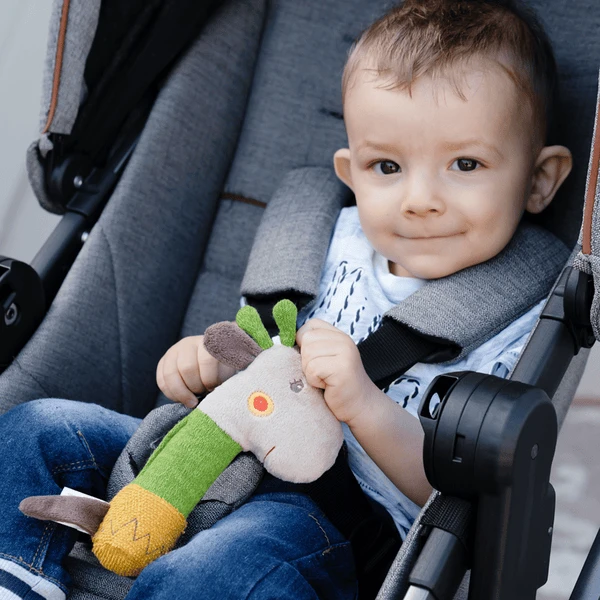 De Giraffe-stanggrijper uit de Loopy & Lotta-collectie kan worden gegrepen, gevoeld, gerammeld en gepiep, waardoor de belangstelling van de baby wordt gewekt en hij wordt uitgenodigd om te ontdekken en te onderzoeken. De stick rammelaar met pieper bevordert het gehoor, de tastzin en de fijne motoriek van de baby en is daarom ideaal als geschenk voor de geboorte, de doop of de verjaardag. Kleine ontdekkingsreizigers nemen de schattige giraf snel mee in hun hart en nemen hem overal mee als trouwe metgezel – thuis, onderweg, in het autostoeltje of in de auto!