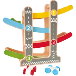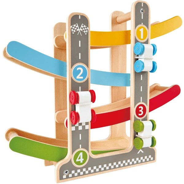 Kijk hoe je raceauto´s tijdens de snelle rit naar beneden rijden.