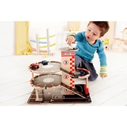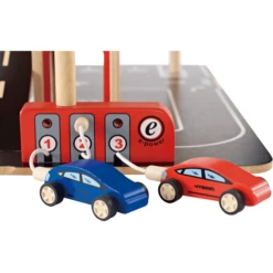 Inclusief twee auto’s en een helicopter.Afmetingen (lengte, breedte, hoogte): 48 x 30 x 37,4 cm Materiaal: hout, verf op waterbasis Aantal onderdelen: 4 (parkeergarage met 4 verdiepingen, 2 auto’s en 1