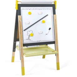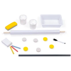- Inhoud: 6 magneten, 10 krijtjes, 1 viltstift (droog), 1 papierrol en 1 penseel voor het bord.