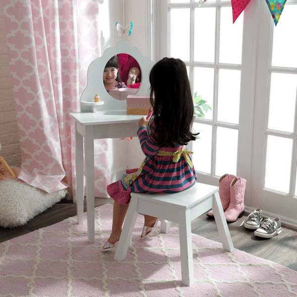 Ieder meisje heeft een kaptafel nodig om juwelen, haarborstels en haarspeldjes te bewaren. De middelgrote houten kaptafel met kruk van KidKraft vormt het stijlvolle middelpunt van elke meisjeskamer. Komt met: