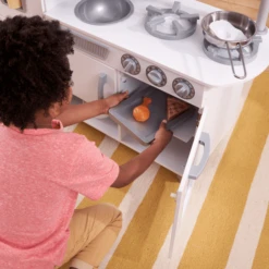 Eet smakelijk! Met onze retro keuken kunnen kinderen doen alsof ze een groot feestmaal voor het hele gezin voorbereiden. Deze heerlijke keuken is gedetailleerd in design en uitgerust met interactieve functies, en is het ideale geschenk voor je kleine chef.