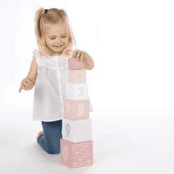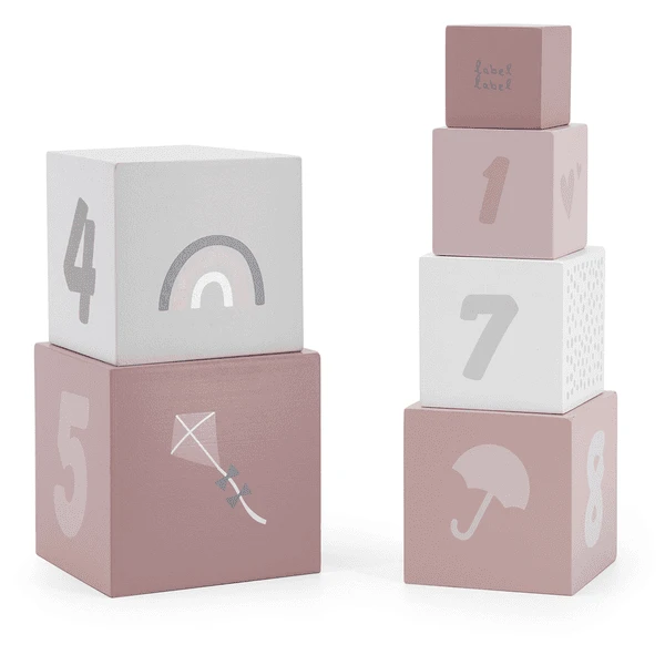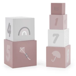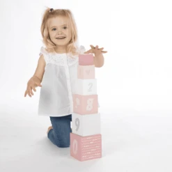 - De genummerde stapel- en nestblokken zijn gemaakt van hoogwaardig FSC-beukenhout en versierd met kindvriendelijke verf op waterbasis in mooie roze, witte en grijze tinten.