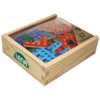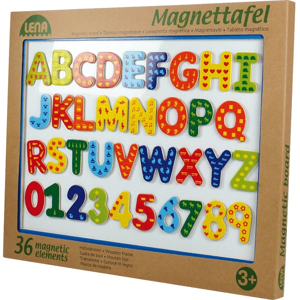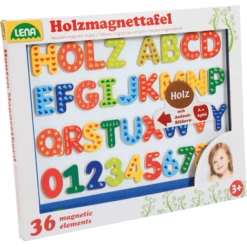 Magneetbord om op te hangen, gemaakt van hout. Met 26 gekleurde letters en 10 gekleurde cijfers.