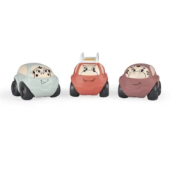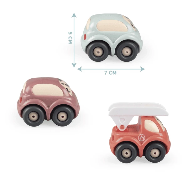 - Er zijn twee auto’s met schattige dierengezichtjes en een brandweerauto met ladder