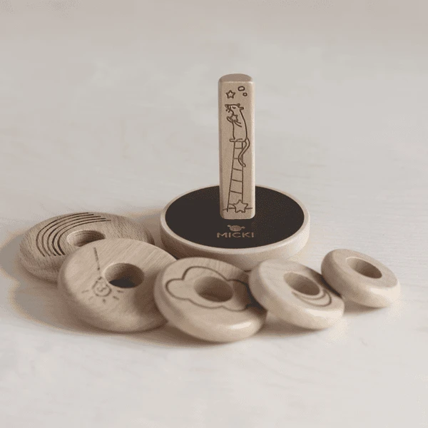 - De premium houten versie van Micki s stapelspeelgoed heeft gegraveerde illustraties van een muisje dat langs de stok klimt.