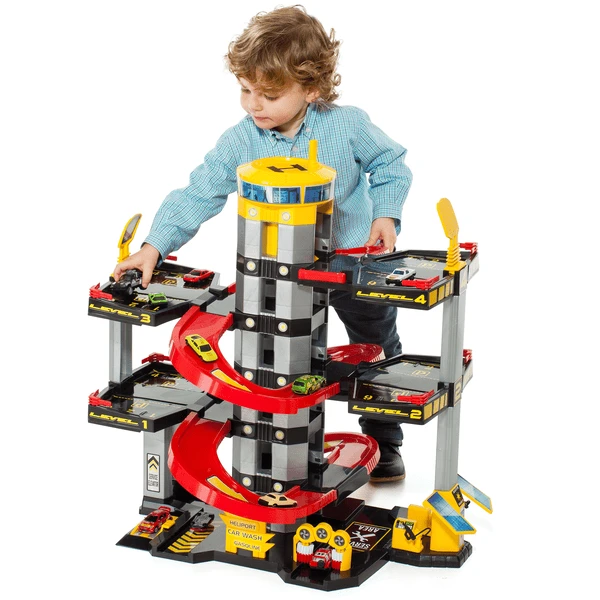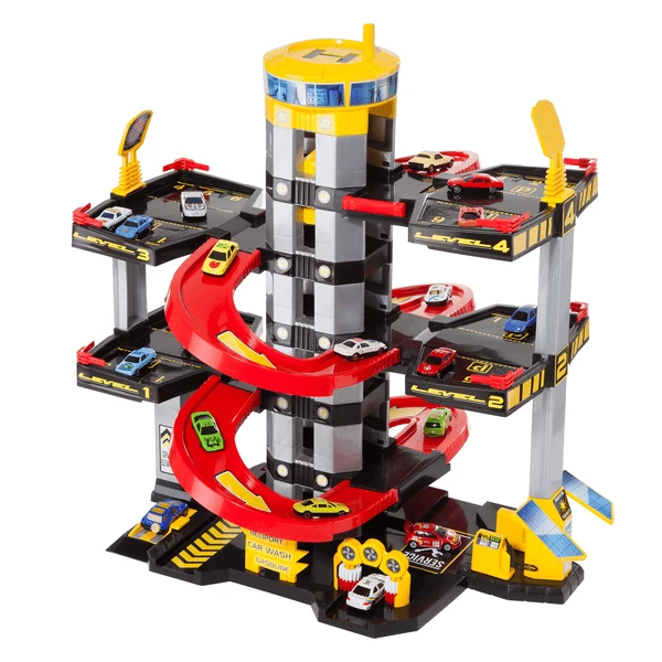 - Parkeerplaats met 4 verdiepingen, lift, benzinepomp, wasstraat en hefplatform.