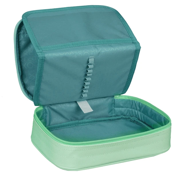 - Binnenin met klein vakje met rits en flap met 9 pennenlussen