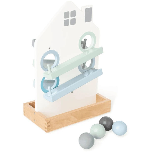 - De knikkerbaan in de vorm van een huis is kleurrijk beschilderd en nodigt kinderen uit om meteen te spelen.