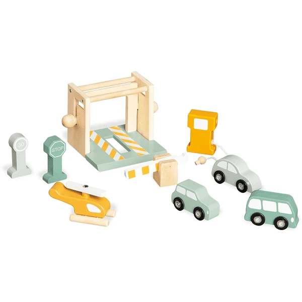- 10 onderdelen: 1 parkeerplaats met meerdere verdiepingen, 1 slagboom, 1 hefplatform, 3 auto’s, 1 helikopter, 2 verkeer child er, 1 benzinepomp