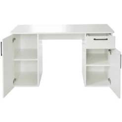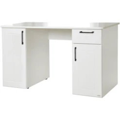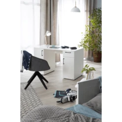aden Het bureau Sylt voor kinderen en tieners van roba in wit decor met gefreesde deur- en ladefronten van MDF geeft uw kinder- en tienerkamer een modern en tijdloze flair. Het kindvriendelijke bureaublad met zijn hoogte wordt optisch afgerond door de stootvaste ABS-beschermranden. Stijlvolle, hoogwaardige zwarte Metal handgrepen op de deuren en laden maken het geheel af. Het grote bureaublad biedt uw kind voldoende ruimte om te spelen, te leren en te lezen. Achter elke deur verdeelt een in de hoogte verstelbare legplank de vrije ruimte en biedt zo opbergruimte op twee niveaus en zorgt voor extra ruimte naast de lade.