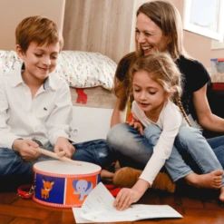 - 1 kindertrommel om om je nek te dragen met dierenmotieven, 2 houten hamers geschikt voor kinderen, 1 liedboek met kinderliedjes om ’s avonds te trommelen en inleiding tot de ritmetheorie.