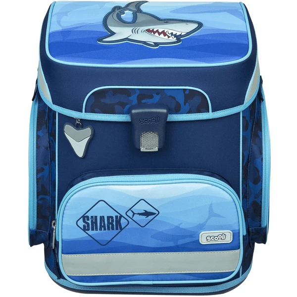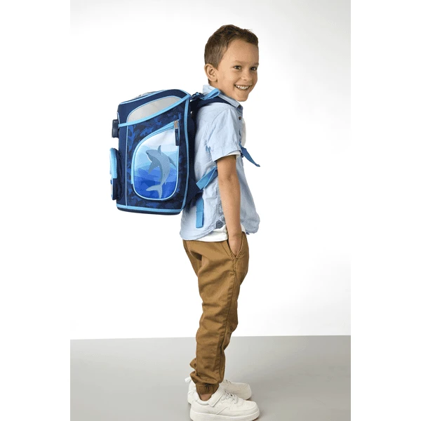 Geboren om te zwemmen. Deze blauwe schooltas is bijzonder cool en gevaarlijk. Wat zwemt er in het water? Het watermotief is voorzien van een haai als een 3D patch.
