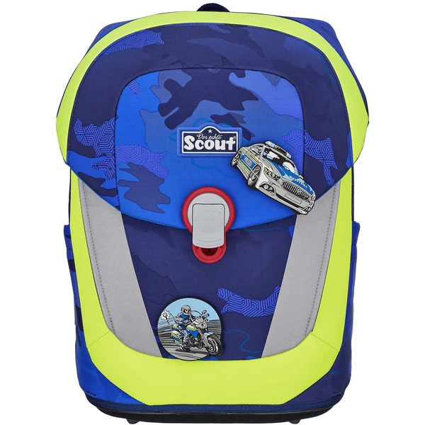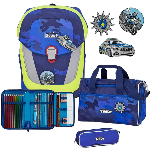 De Scout Sunny II Blue Police schooltas wordt geleverd in een 4-delige set met sporttas, etui inclusief Staedtler kwaliteitspotloden, pennenetui en 3 Funny drukknopen.