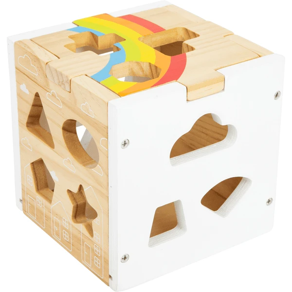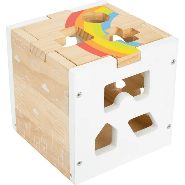 13 verschillend gevormde, gekleurde en deels natuurlijke insteekelementen trainen de kleur- en vormherkenning en de motoriek. Naast de klassieke geometrische vormen zijn er ook wolken, sterren en huizen om in te pluggen! Discrete afdrukken op de natuurlijke houtoppervlakken vullen elkaar harmonieus aan en het afneembare houten deksel kan positief worden aangebracht. Welk plug-in element past in welke opening? Een langdurige activiteit met een leer- en leuk effect voor de allerkleinsten. Door het openen van het deksel wordt het weer kinderspel om alle bouwstenen te verwijderen.