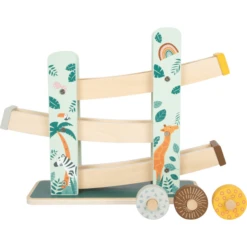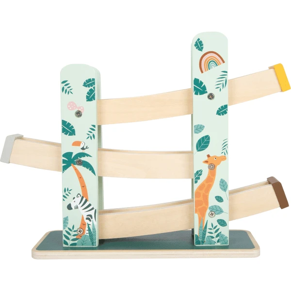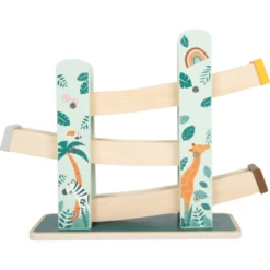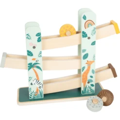 Op deze houten marmeren piste in de trendy ” Safari ” look, racen drie verschillend gekleurde en gedessineerde houten wielen over de drie hellingen.