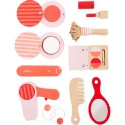 - Itemgehalte: 1 etui, 1 haardroger, 1 lippenstift met deksel, 1 stijltang, 1 penseel, 2 oorbellen, 1 handspiegel, 1 penseel, 1 oogschaduw, 1 blush, 1 make-up.