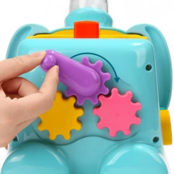 De stevige houten kubus met afneembare, draaiende motorlus aan de bovenkant van de kubus is ingebed in het lichaam van een kleine, blauwe olifant van stevig plastic. De leuke dieren- en circusillustraties l aden nodigen kinderen uit om te spelen en de vele verschillende manieren van spelen met de kubus te ontdekken: kinderen tellen gekleurde ringen, laten een gekleurde bal dansen op de slurf van de olifant, draaien drie gekleurde tandwielen en maken daarbij grappige geluiden, of begeleiden vakkundig een leeuw en een beer op hun avonturen in de circusring.