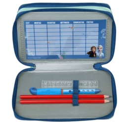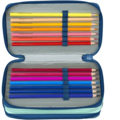 De etui biedt voldoende ruimte voor potloden, liniaal of puntenslijper in drie vakken. De pennenlussen zorgen voor orde. Het etui is gevuld met 21 hoogwaardige driehoekige kleurpotloden van Eberhard-Faber, 2 driehoekige potloden van Eberhard-Faber, een gum, een liniaal van 17 cm, een puntenslijper, twee ABC-stencils, een driehoek en een lesrooster. De dienstregeling bevindt zich in een kijkvenster compartiment en kan indien nodig worden vervangen. De Eberhard Faber potloden zijn gemaakt van 52% gerecycled materiaal.
