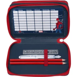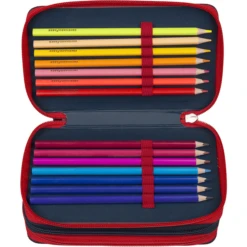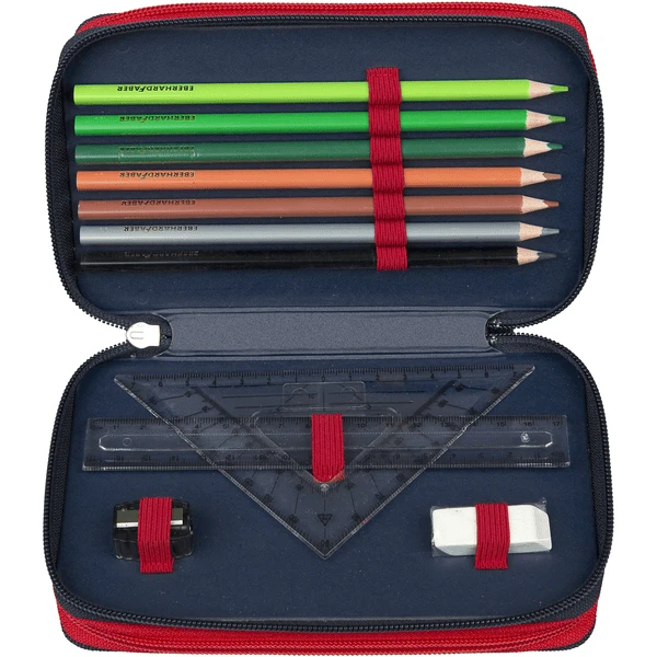 De etui biedt voldoende ruimte voor potloden, linialen of puntenslijpers in drie vakken. De pennenlusjes houden alles netjes. Het etui is gevuld met 21 hoogwaardige driehoekige kleurpotloden van Eberhard-Faber, 2 driehoekige potloden van Eberhard-Faber, een gum, een liniaal van 17 cm, een puntenslijper, twee ABC-stencils, een geodriehoek en een lesrooster. De dienstregeling bevindt zich in een kijkvenster compartiment en kan indien nodig worden vervangen. De Eberhard Faber potloden zijn gemaakt van 52% gerecycled materiaal.
